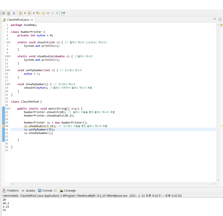 - 아래 NumberPrinter.showInt(20); 을 보면 인스턴스가 생성되기 전에 클래스 메소드가 호출된 것으로 보아 클래스 메소드는 어느 인스턴스에도 속하지 않는다.