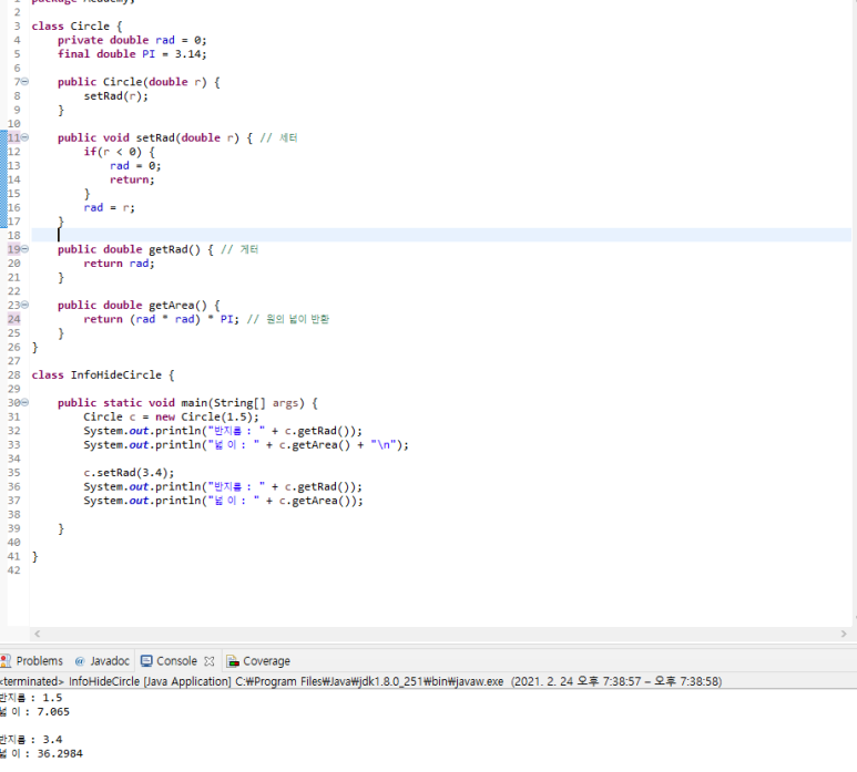 - private 선언을 한 값을 가져오기 위한 세터(값의 설정을 위한 메소드)와 게터(값의 참조를 위한 메소드)가 필요하다.