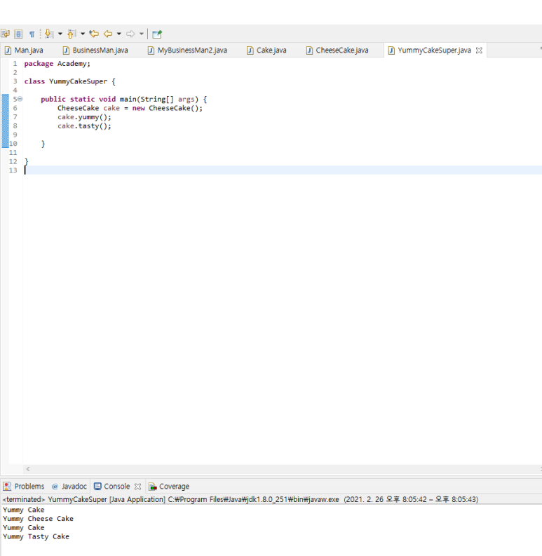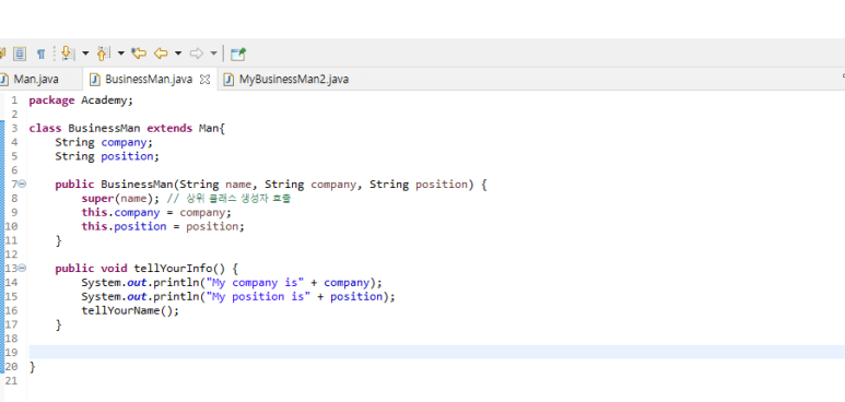 - Man 클래스를 상속받는 BusinessMan 클래스에서 super(name)으로 상위 클래스의 생성 자를 호출하고 있다.
