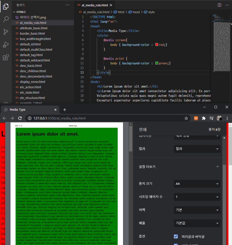 ※ media 속성을 사용한 미디어 쿼리 사용 예시(스타일시트속 내용은 위 예제와 동일)