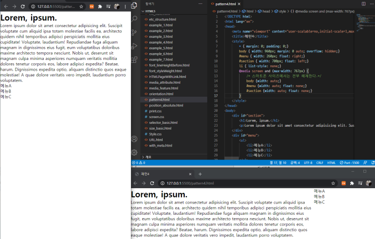 .3) 너비가 큰 화면(데스크톱)에서는 메뉴가 왼쪽, 너비가 좁은 화면(모바일 장치)에서는 메뉴가 아래쪽