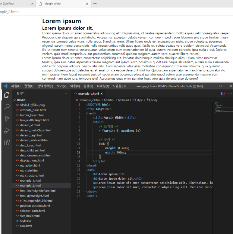 (1) 중앙 정렬하고 싶은 태그에 width 속성을 부여하고 margin 속성을 ‘0 auto’로 입력