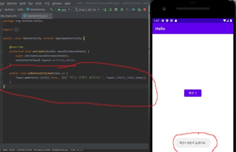 ...- activity_main.xml 파일에 들어 있는 버튼에 onClick 속성 값으로 클릭 이벤트를 처리할