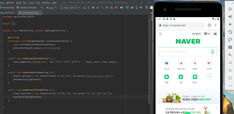 ...- MainActivity.java 파일을 열고 XML에서 지정한 함수를 추가한다.