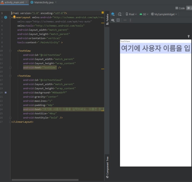 ....지정하는 방법을 더 권장한다. 왜냐하면 XML 레이아웃 파일은 화면 전체 또는 일부를
