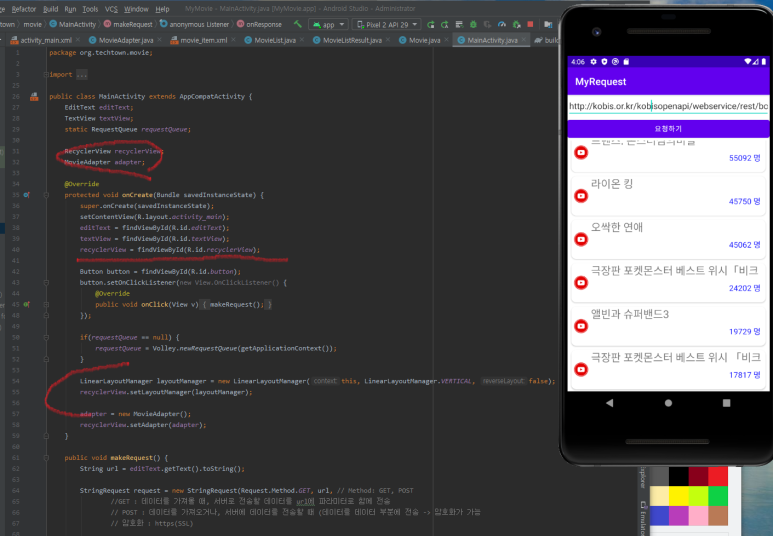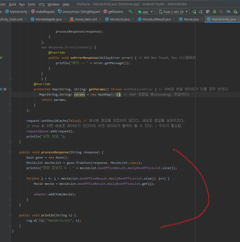 ☞ processResponse() 메서드 안에서는 Gson 을 이용해 JSON 문자열을 MovieList 객체로 변환하며 그 안에 들어있는 Movie 객체들을 하나씩 꺼내어 어댑터에 추가합니다. 어댑터에 모두 추가했다면 notifyDataSetChanged() 메서드를 호출해야 변경 사항이 반영됩니다.