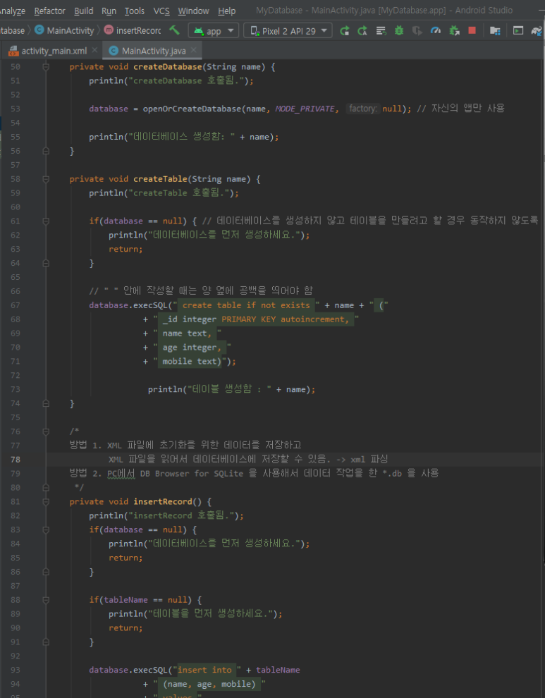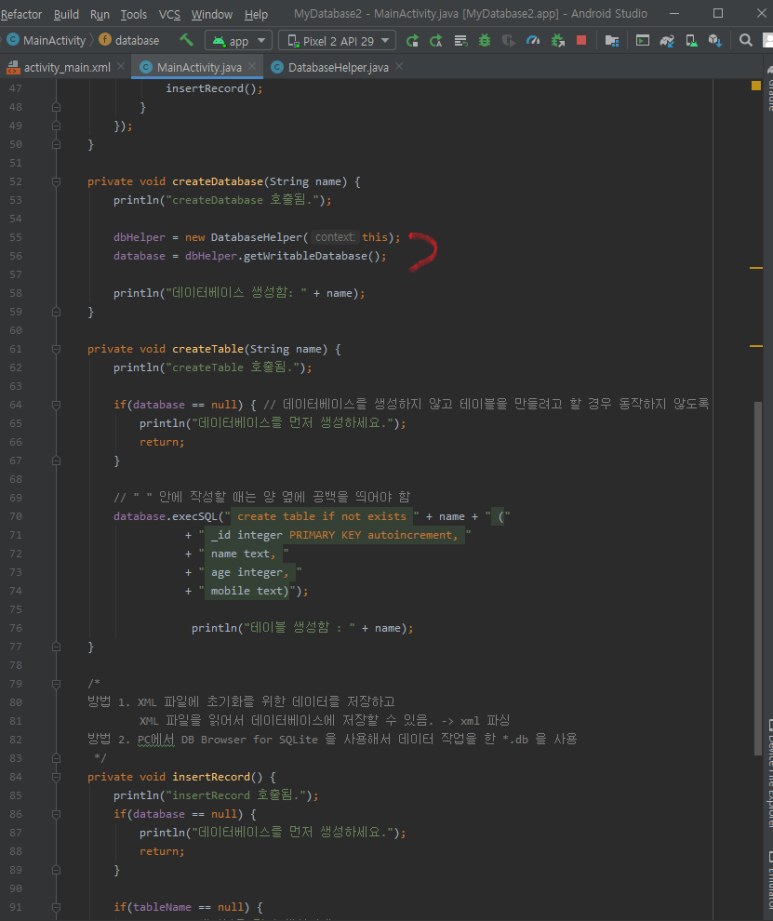 ..... 데이터베이스를 열거나 만든 후에는 SQLiteDatabase 객체를 참조해야 합니다.