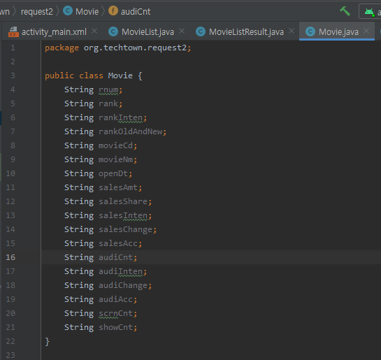 응답데이터 가장 바깥이 중괄호이므로 이 객체를 반환할 클래스로 MovieList 라는 이름의 클래스를 정의했습니다. // {”boxOfficeResult" // 이 클래스 안에는 boxOfficeResult 라는 이름의 변수를 추가하는데, 변수의 이름은 JSON 문자열에서 속성의 이름과 같아야 합니다. 그리고 변수의 자료형은 JSON 문자열에서 속성 값의 자료형과 같아야 합니다. JSON 문자열에서 boxOfficeResult 속성의 값이 객체이므로 이 객체를 반환하여 담아둘 클래스를 MovieListResult 라는 이름을 추가합니다.