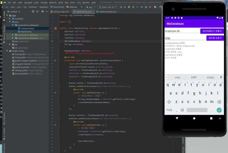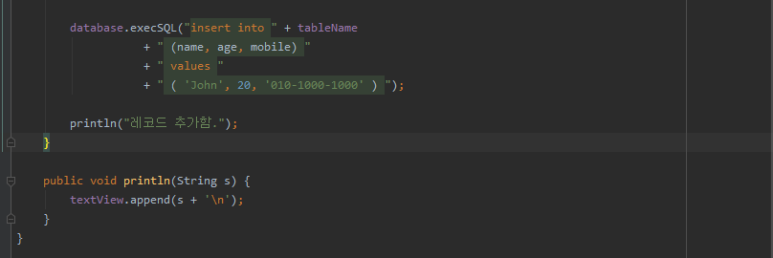 2. SQLiteDatabase 객체에서 가장 중요한 메서드 중의 하나는 execSQL() 입니다. 이 메서드는 데이터베이스를 만들고 난 다음 SQL문을 실행할 때 사용됩니다. 따라서 이 메서드를 이용하면 테이블을 만드는 것뿐만 아니라 레코드 추가처럼 표준 SQL을 사용하는 여러 가지 데이터 처리가 가능합니다.