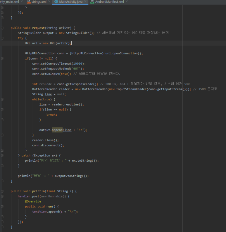 ☞ 버튼을 누르면 사용자가 입력한 사이트 주소를 이용해 request() 메서드를 호출합니다. 이 메서드 안에는 인터넷을 사용할 것이므로 스레드 안에서 동작하도록 스레드 객체를 생성하고 그 안에서 메서드를 호출하도록 합니다.