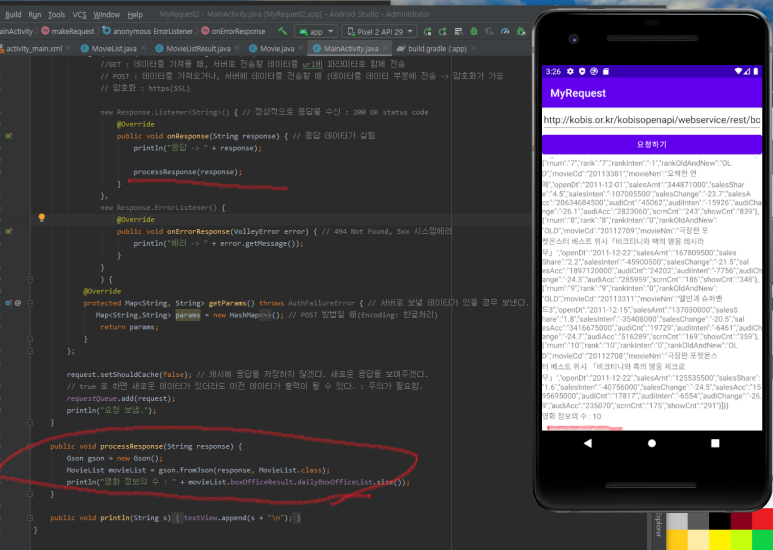 ☞ Gson 객체에는 fromJson() 메서드가 있어서 문자열을 자바 객체로 바꿀 수 있도록 합니다. 첫번째 파라미터는 문자열이고 두번째 파라미터는 어떤 클래스인지를 지정하기 위한 클래스 객체입니다. 이렇게 변환하면 응답 JSON에 들어 있는 영화 정보의 개수를 바로 확인할 수 있습니다.