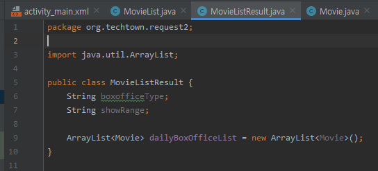 ☞ JSON 문자열의 속성 중에서 값이 배열인 경우, 즉 대괄호로 표시된 경우에는 클래스를 정의할 때 ArrayList 자료형을 사용할 수 있습니다. 그리고 그 배열 안에 다시 객체들이 들어가는 경우 해당 객체들을 위한 클래스를 추가로 만들어야 합니다. ( 객체들을 위한 클래스 = Movie)