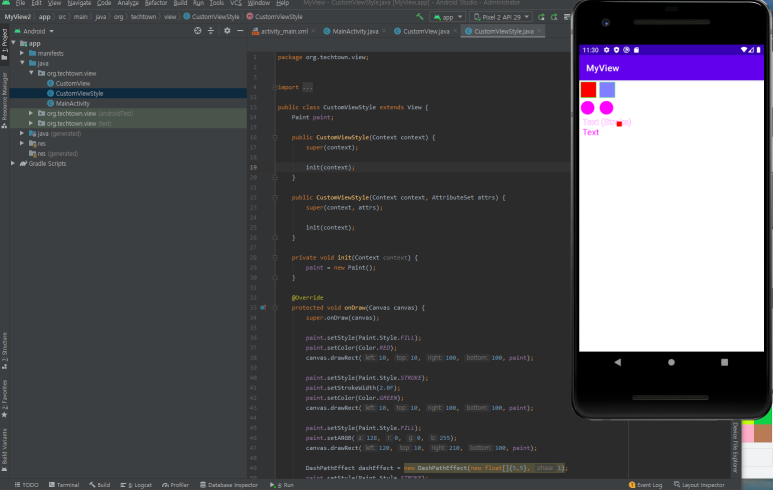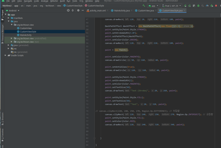 onDraw() 메서드 내에 사각형을 그리는 메서드를 호출합니다. |
