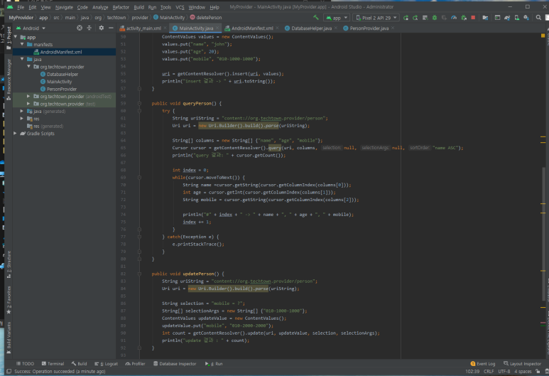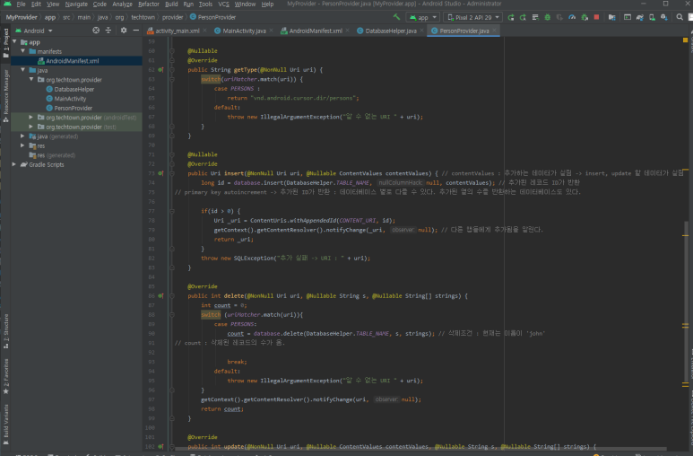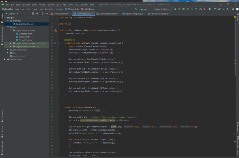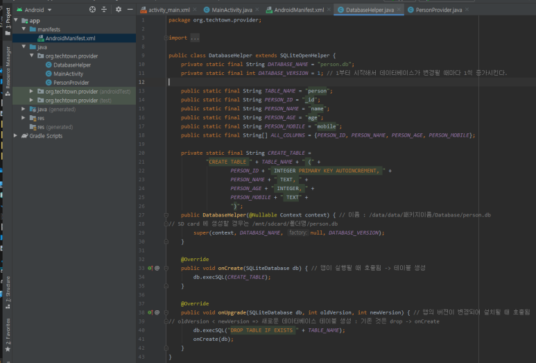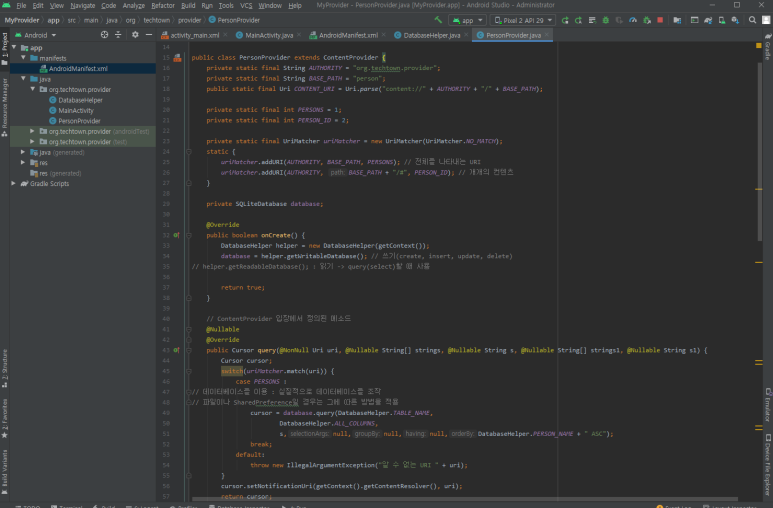 ☞ 내용 제공자를 만들기 위해서는 고유한 값을 가진 content URI를 만들어야 합니다. 여기에서는 앱의 패키지 이름과 person 테이블의 이름을 합쳐 content URI를 정의했습니다.