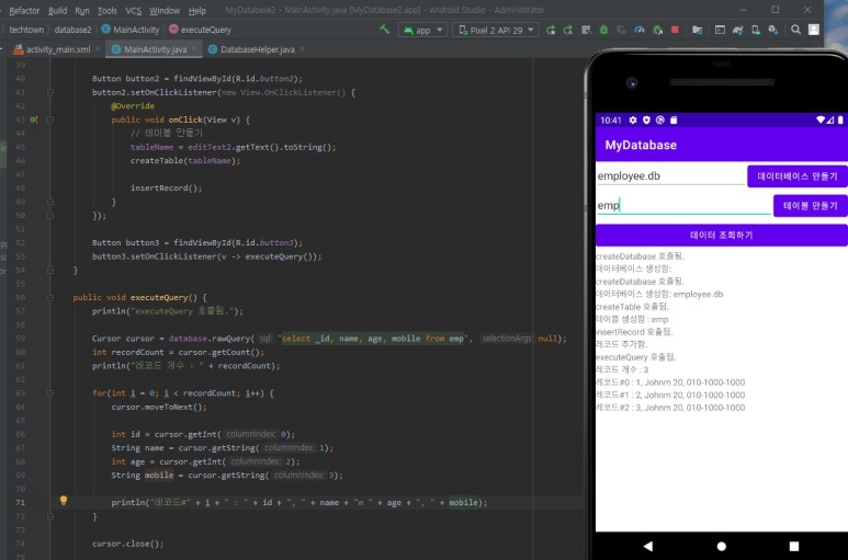 Cursor 객체는 moveToNext() 메서드를 호출하면서 결과 레코드를 넘길 수 있으므로 while 문 안에서 moveToNext를 호출하면서 각 레코드의 값을 출력하도록 합니다.