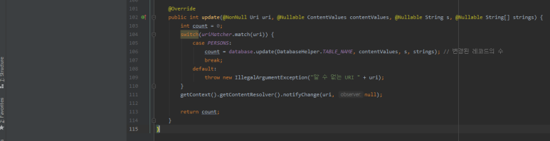 ☞ UriMatcher 객체는 URI를 매칭하는 데 사용됩니다. match() 메서드를 호출하면 UriMatcher에 addURI() 메서드를 이용해 추가된 URI 중에서 실행 가능한 것이 있는지 확인해줍니다.