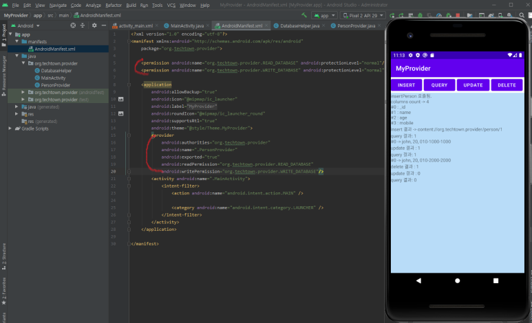 2. 내용 제공자도 앱 구성요소이기 때문에 시스템에서 관리하며 매니페스트 파일에 등록해야 사용할 수 있습니다.