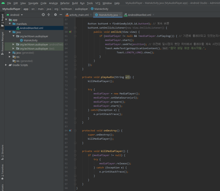 ..3) start() 메서드를 호출하여 음악 파일을 재생합니다.