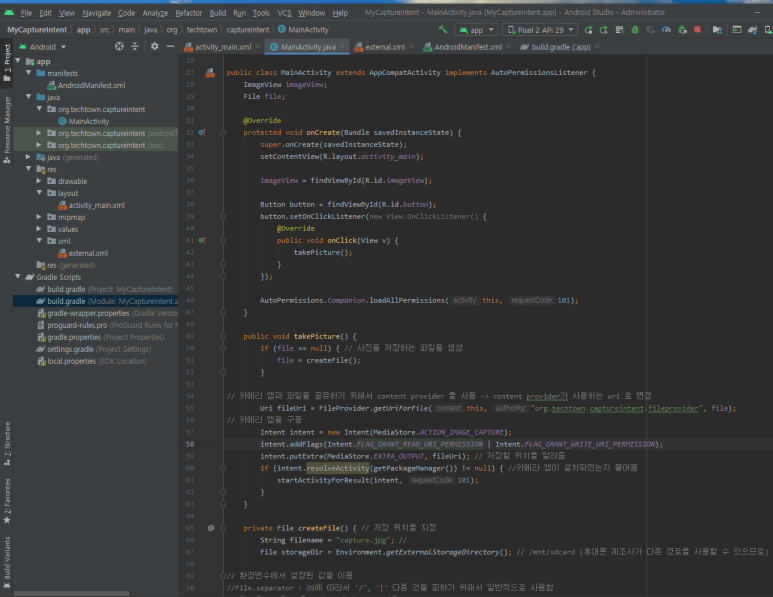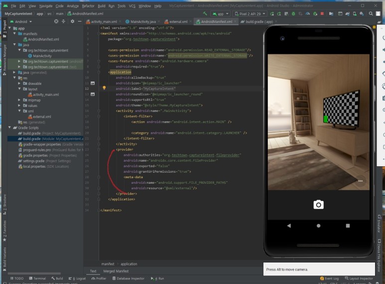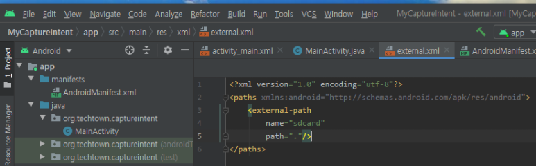 ☞ 이렇게 만든 파일을 카메라 앱이 사용할 때는 다른 앱에서 파일을 공유해야 하므로 내용 제공자(Content Provider)를 만들어 해당 폴더를 공유할 수 있게 해야 합니다.