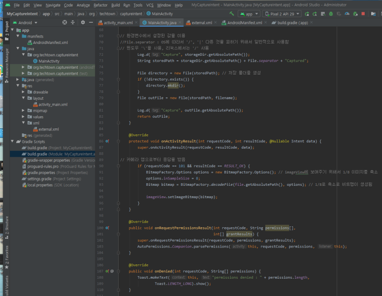 ..1) 인텐트로 단말의 카메라 앱을 실행한 후 결과 사진을 받아 처리하기
