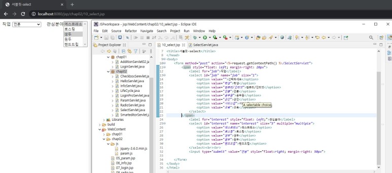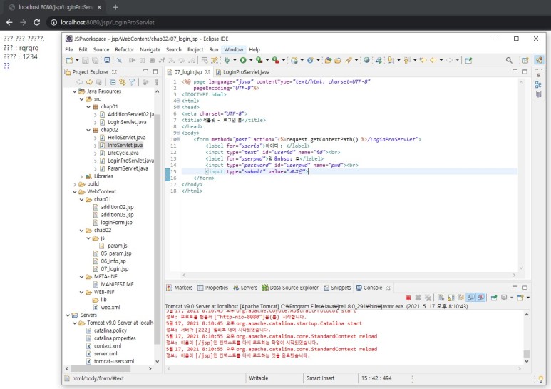 2) 브라우저로 결과를 출력하는 부분은 jsp로 대체하고, 순수 자바 처리 부분은 서블릿으로 처리