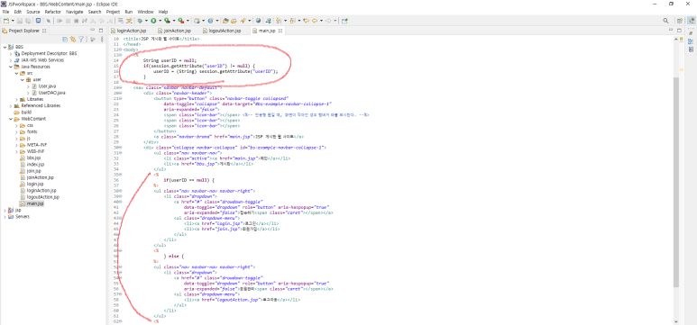 main.jsp를 생성하여 세션을 가져오고 userID가 null 일 경우와 아닐 경우를 나누어 보여주는 페이지를 결정하게 한다.