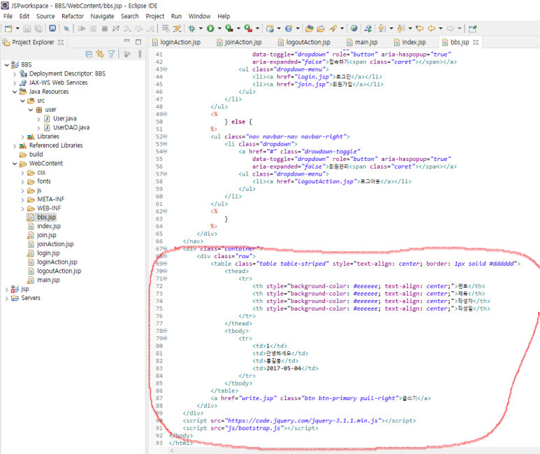 main.jsp 를 복사하여 bbs.jsp를 만든 후 active 를 게시판쪽으로 옮긴다.