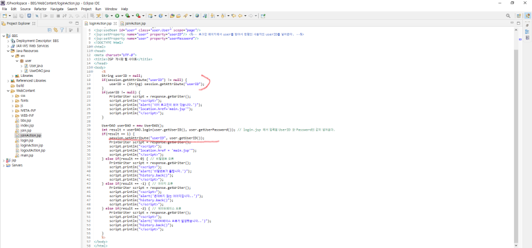 userID가 null 이 아닐 경우는, 이미 로그인이 되어 있는 경우이므로 main.jsp로 이동시키고