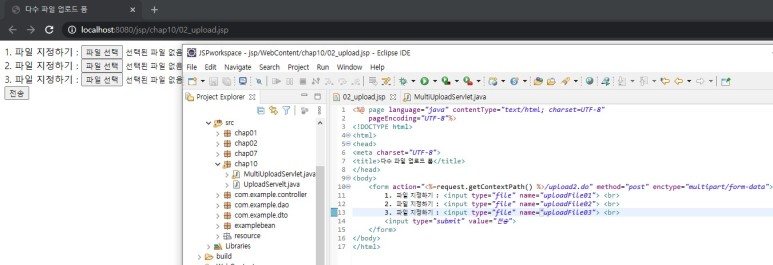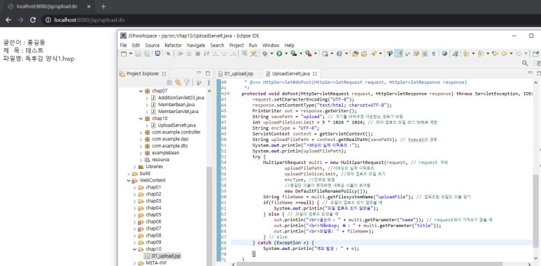 2. MultipartRequest 클래스를 서블릿(UploadServlet.java)에 구현한다.