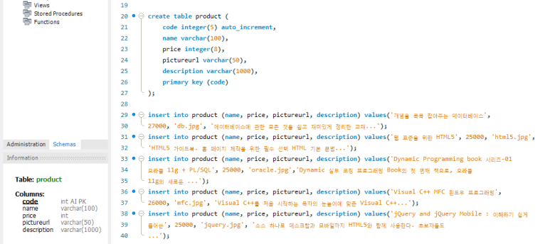 1. studydb 데이터베이스에 product 테이블을 생성한 후, 상품정보를 추가한다.