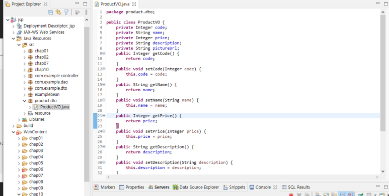 2. ProductVo.java를 생성하여 관계 데이터베이스의 레코드에 대응되는 자바 클래스를 만든다.