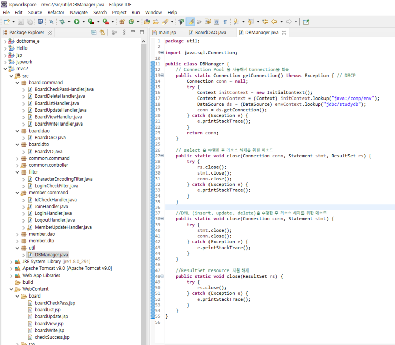 5. util.DBManager.java 를 생성합니다. (JDBC 를 관리하는 클래스입니다.)