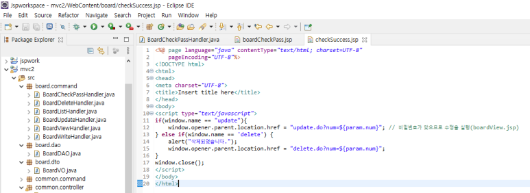 check_pass.do 로 이동하면서 board.num 값을 파라미터로 주고 update, delete name을 줍니다.