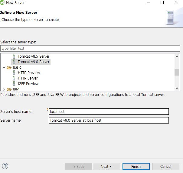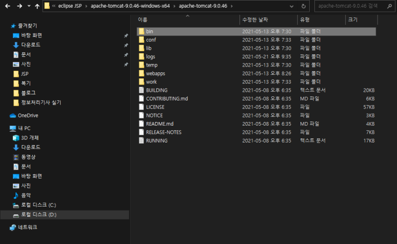 3. 왼쪽 하단의 Server를 눌러 Server를 생성합니다. Apache 폴더를 눌러 톰캣9.0을 선택한 후 Next 를 누릅니다. 그 후 창에서 사용하는 JRE로 바꿔줍니다. 이때 톰캣 서버경로는 아래 사진처럼 bin 폴더가 보이는 화면까지의 경로입니다. 제 컴퓨터 기준으로는 D:\eclipse JSP\apache-tomcat-9.0.46-windows-x64\apache-tomcat-9.0.46 입니다.
