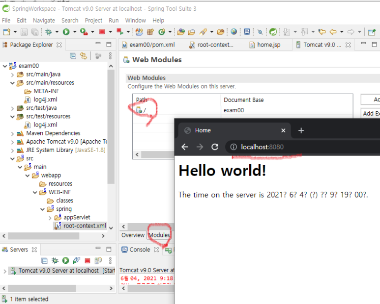 7. 서버를 더블클릭하여 Modules 를 열고 컨텍스트를 '/' 로만 하여 서버를 수정한 후 서버를 실행하여 크롬 주소창에 localhost:8080/ 을 입력하여 해당 화면이 나오면 성공입니다.