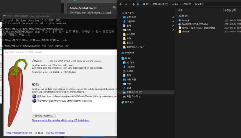 7) 다운받음 lombok.zip을 여기에 풀기로 다운로드에 풉니다.