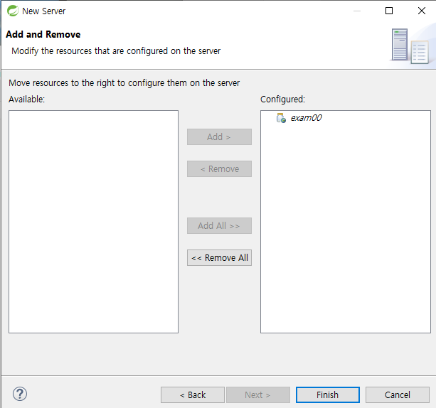 4. 3 번후 next를 누른후 ADD로 해당 프로젝트를 오른쪽으로 옮긴 후 Finish를 하면 서버구축이 완성됩니다.
