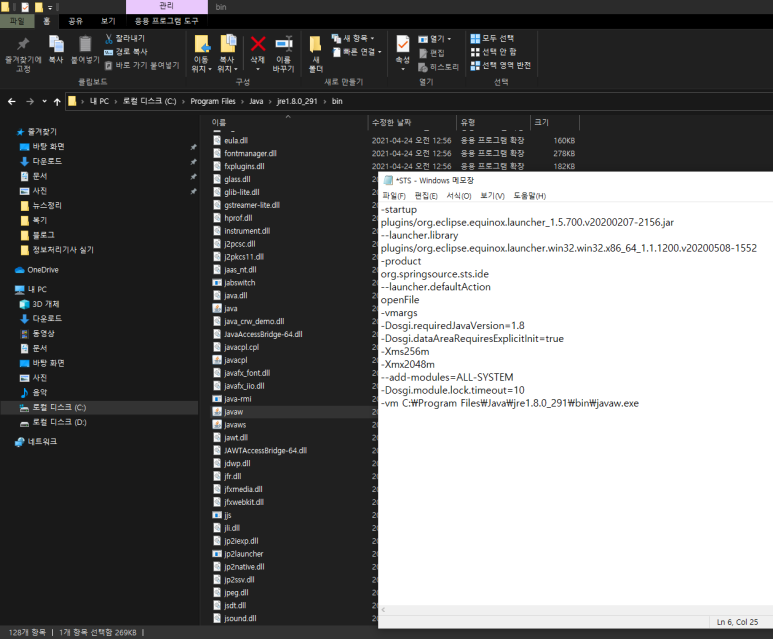 5) 편집 창을 열면 메모장이 나오는데 사용하는 자바(1.8.0_291)경로에 javaw.exe 파일을 입력해줍니다.
