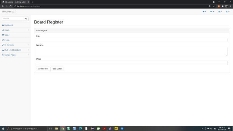 localhost:8080/board/register 를 입력하였을 때 다음과 같이 나오면 됩니다.