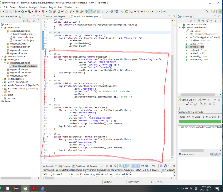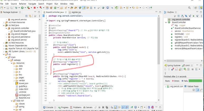 2) BoardControllerTests에 해당 메소드들을 테스트하는 메소드들을 추가한 후 테스트합니다.