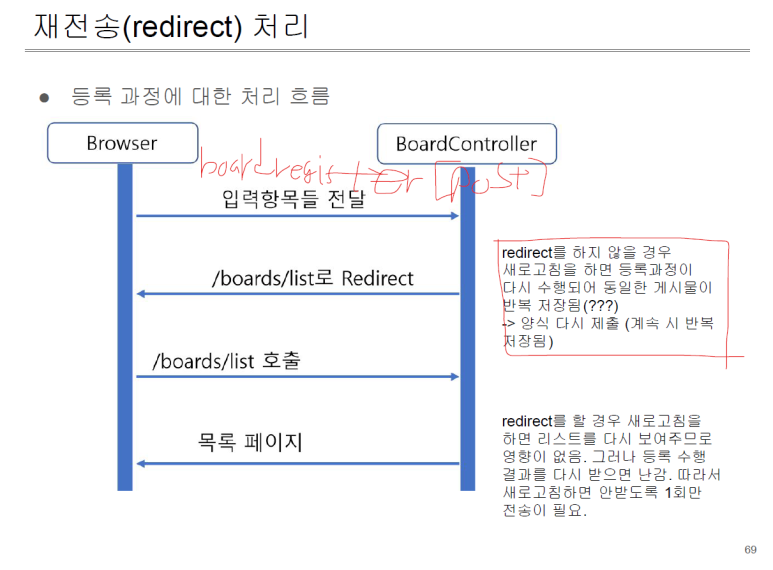 1) redirect를 하지 않을 경우 새로고침을 하면 등록과정이 다시 수행되어 동일한 게시물이 반복저장됩니다.