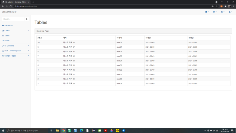 서버를 키고 localhost:8080/board/list 를 입력했을 때 DB 에 있는 내용물이 나오는 것을 확인할 수 있습니다.