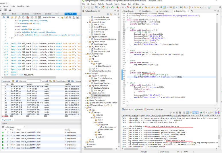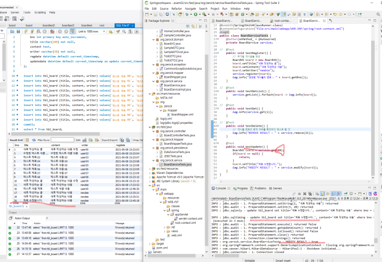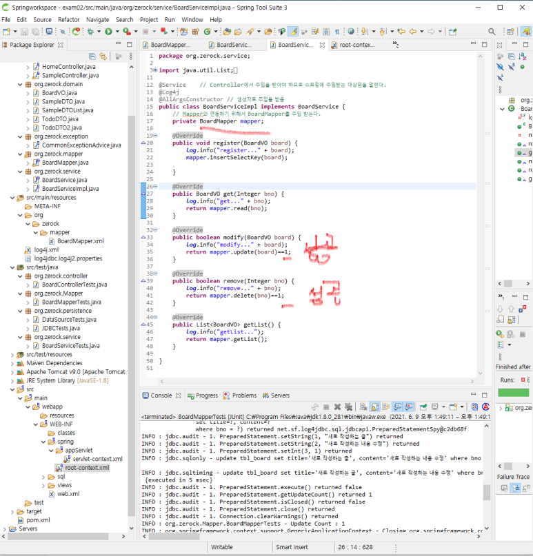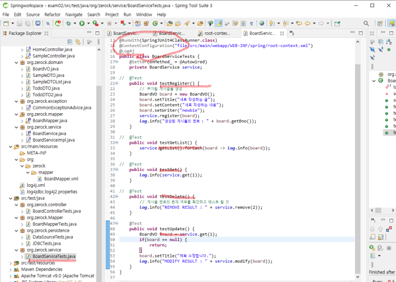 2) src/test/java 에 org.zerock.service.BoardServiceTests.java 를 만들어 각 기능을 구현합니다.