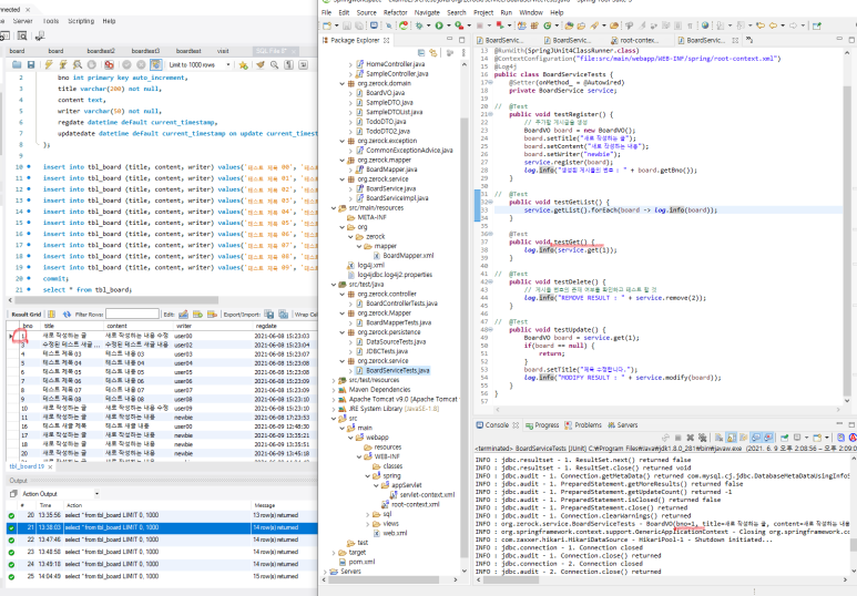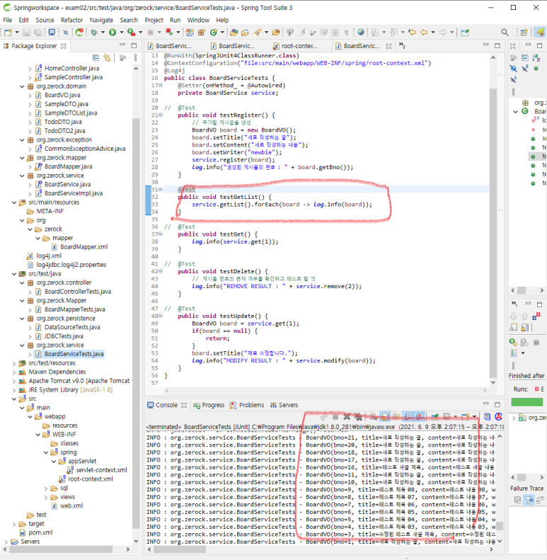 BoardControllerTests.java 콘솔을 보면 list를 성공적으로 가져왔음을 확인할 수 있습니다.