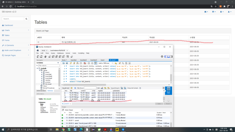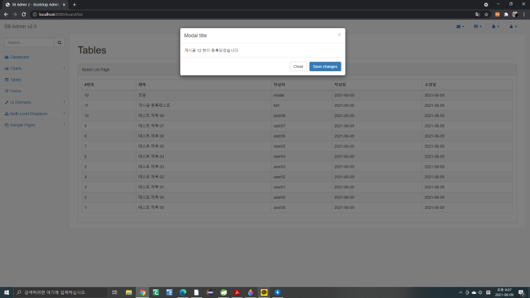 8) localhost:8080/board/list 로 이동하여 데이터를 하나 등록하고 modal 이 작동함을 확인합니다.