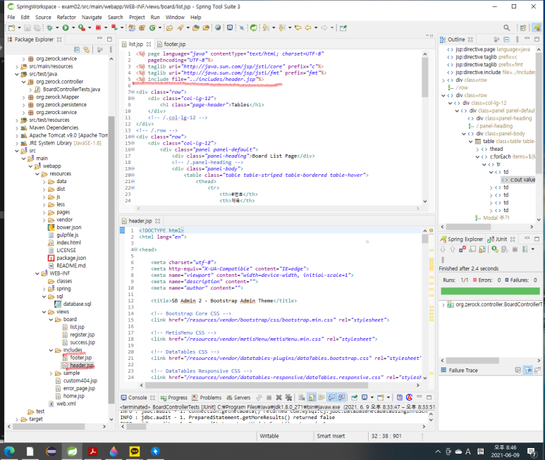 4. list.jsp 의 3줄 ~ 378줄 부분을 잘라서 src/main/webapp/WEB-INF/views/includes/header.jsp 에 붙여넣습니다. 또한 list.jsp에는 <%@ include file="../includes/header.jsp" %>를 추가합니다.