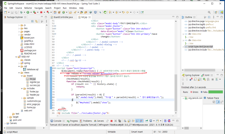 6) list.jsp 에 해당 javascript를 추가하여 모달창 혹은 알람창이 1번만 나오게 합니다.