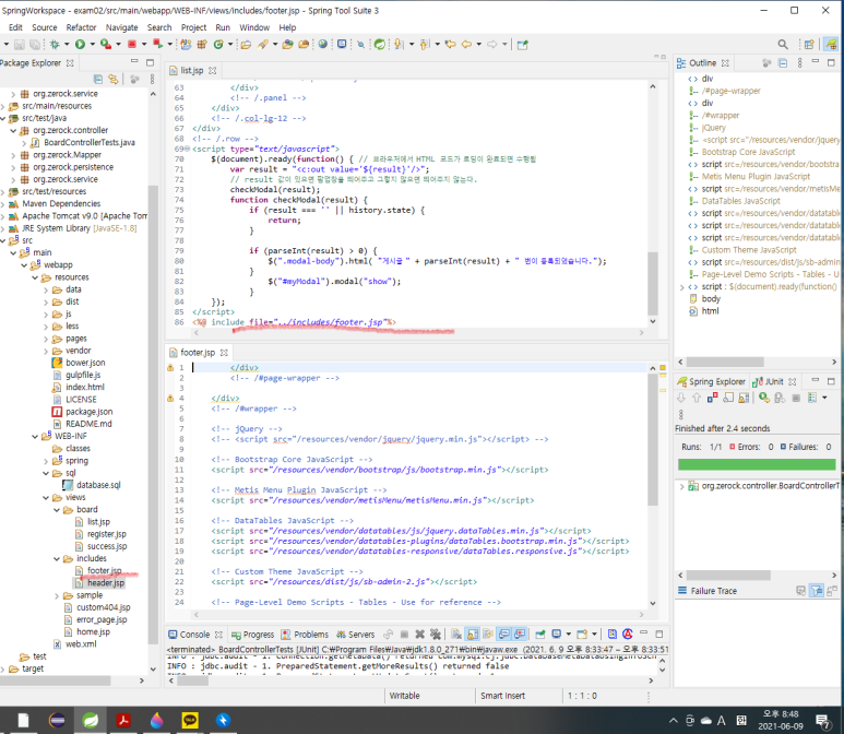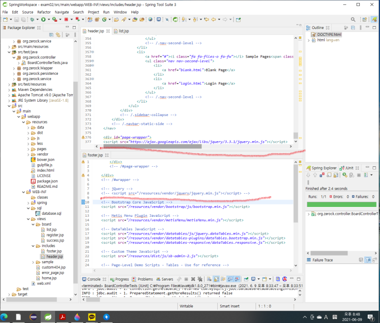 6. footer.jsp 에 있는 jQuery 라이브러리를 주석처리하고 header.jsp의 새로운 라이브러리를 추가합니다.