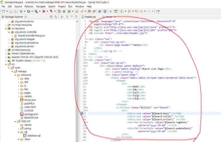 8. 목록 화면을 처리하기 위해 list.jsp 를 다음과 같이 변경합니다.