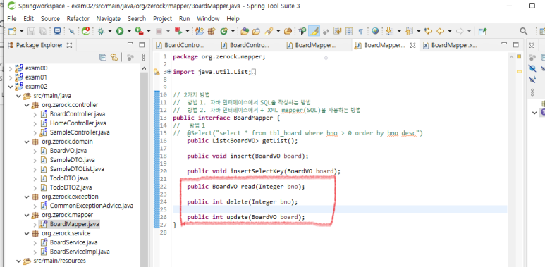 1. BoardMapper.java (인터페이스) 에 read(Integer bno), delete(Integer bno), update(Integer bno)를